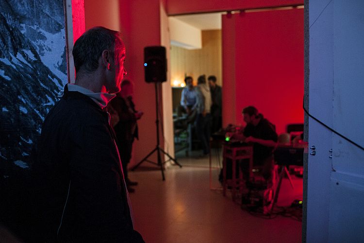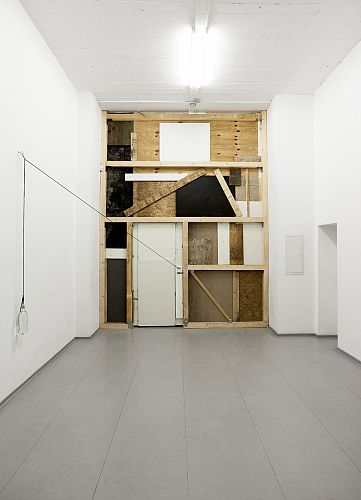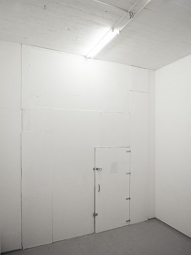 Hierbei unterscheidet sich der ganz im Weiß gehaltene Raum, der permanent zugänglich ist, von dem Ausstellungsraum hinter der Wand! Durchtritt der Besucher zu den offiziellen Öffnungszeiten die neugezogene Wand durch die neu installierte Tür, trifft er auf ein raumfüllendes Wandbild, welches, aus Fundholz zusammengesetzt, die Rückseite des Whitecube darstellt. Die Tür, welche zur Eröffnung entnommen wurde und erst wieder zur Finissage eingesetzt wird, findet sich hier, im hinteren Teil der Ausstellung als Exponat wieder. Überdeckt von einem Vorhang den Hunziker aus seinem Wohnatelier in Zürich mitgebracht hat. Ein weiteres Objekt und gleichzeitig die stärkste Referenz auf Hunziker’s Background zu der Hausbesetzter Szene, ist ein “automatisches” Türschließsystem welches in besetzten Häusern eingesetzt wird, um die Wärme in den Räumen zu bewahren.